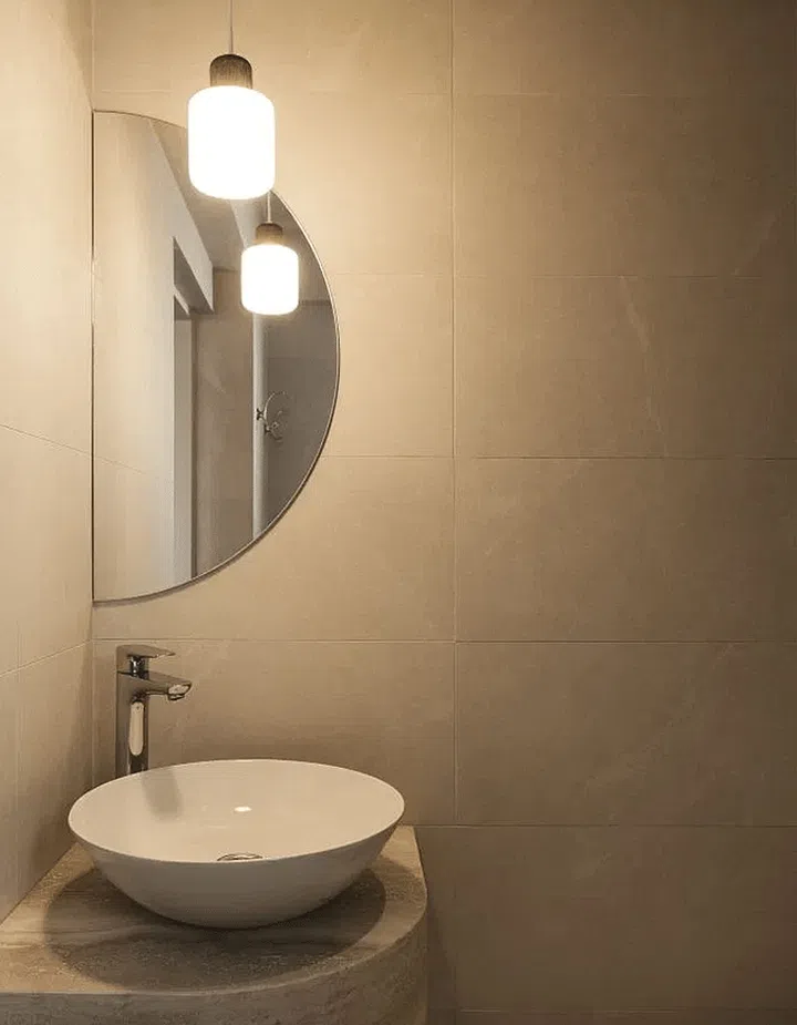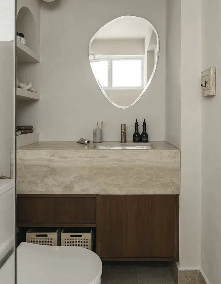 The master bathroom takes on a more luxurious and indulgent look, with a stone counter and a large organically-shaped mirror.