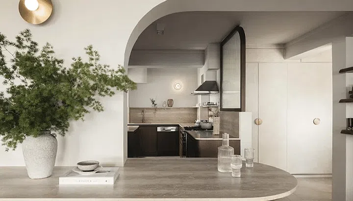 In the kitchen, the width of the backsplash is similar to the width of the windows in the living area, visually this creates the illusion of a spacious home that extends from one end of the room to the other.