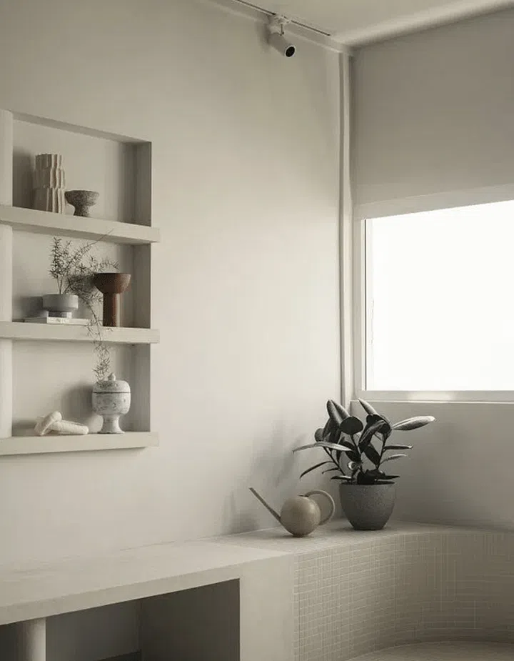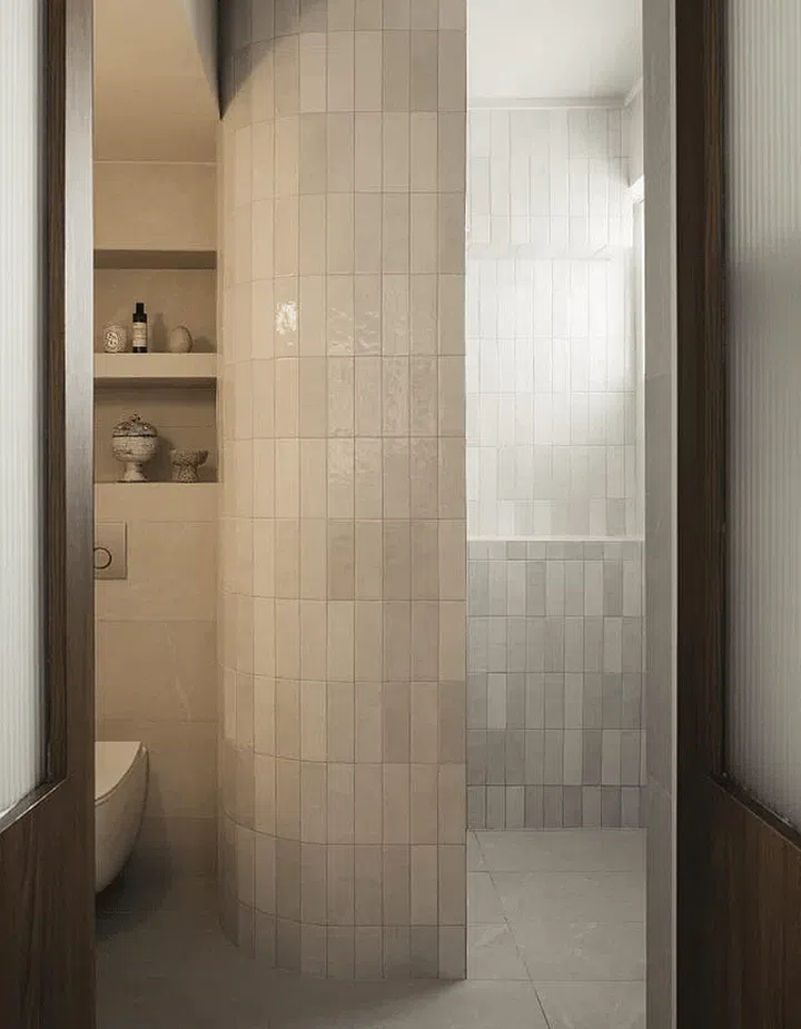 The curves continue into the bathroom, where the show area is cordoned off with a curved tiled wall.