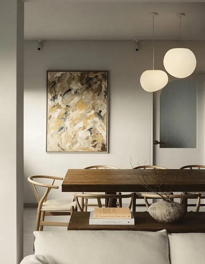 Notice how the artwork on the wall in the dining area also picks up the hues used in the colour scheme.