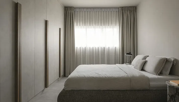 The wardrobe has been built into the wall opposite the bed. By using up the entire space along the wall, the wardrobe becomes a concealed feature, with slim long handles to tell you where they are located.