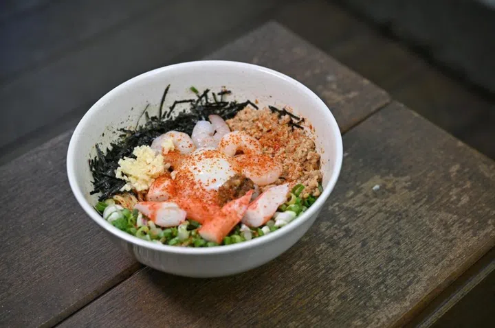Ingredients make up 40 per cent of operating expenses, yet he keeps prices competitive, aiming to recover costs through volume. Dishes start at $6.90 for a regular Original Mazesoba, comprising noodles with minced pork, spring onion, nori, onsen egg; and go up to $10.90 for a large order of Spicy Seafood Mazesoba with prawns, crab sticks and Japanese fish powder seasoning.