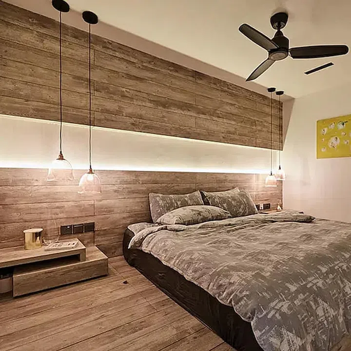 Despite the drop ceiling and platform bed, the bedroom still feels spacious, thanks to the horizontally placed laminates which visually elongate the room.