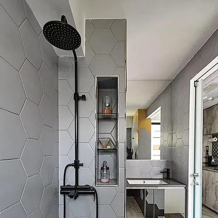 The grey hexagonal tiles are a good match with the concrete screed floors in the living room and kitchen. And, can you spot the pop of yellow here?