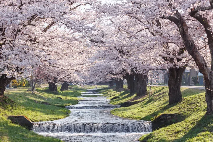 Kannonji River in Fukushima is a charming location to view cherry blossoms. Its riverbanks are lined with hundreds of cherry trees, capturing a stunning pink corridor that as the cherry blossoms are reflected on the waters below. The cherry trees typically bloom in mid to late April.