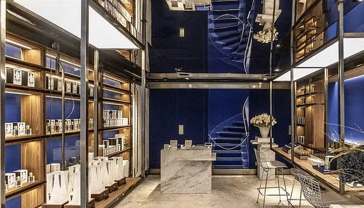 The boutique aims to create for customers the experience of being their own perfumers. With half of the store displaying its full range of fragrances (including limited-edition collaborations not available to purchase elsewhere), the other half is laid out like a mini-laboratory with beakers, weighing scales and other scientific apparatus.