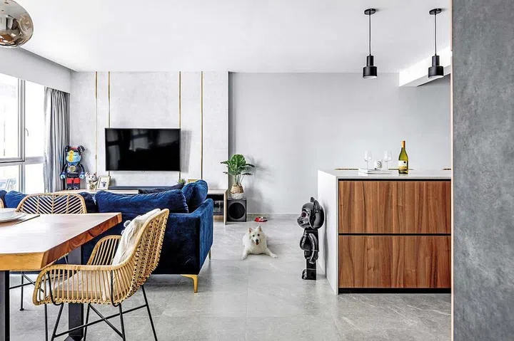 In the background, deep colours and raw finishes lend the home an industrial look, balanced out by luxe brass and marble accents. The TV wall in the living room, for example, features brass inlays set against a backdrop of concrete. Wei Sheng also added interesting accents with pops of colour, such as the striking navy-blue sofa, and lighter elements like the rattan bar stools.