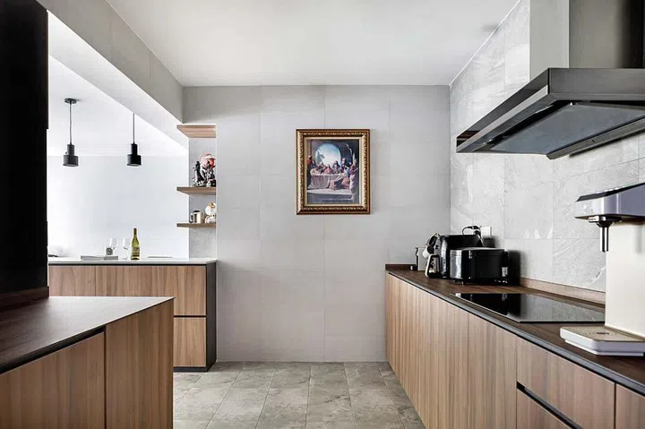 Since the couple frequently hosts gatherings, proper spatial flow between the communal areas was essential. Wei Sheng made this a priority in the design, proposing two separate but linked spaces — the dining area and the dry kitchen area — that guests could move between freely. As the couple does not cook often, they decided to go with a larger dry kitchen and smaller separate wet kitchen, maximising the space outside for entertainment.