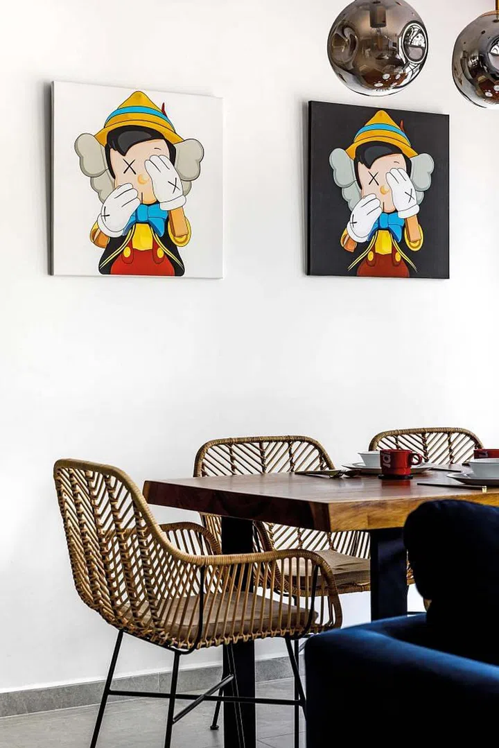 The couple’s toy collection includes popular icons such as the shark from Japanese brand A Bathing Ape and Bearbrick figurines. Paired with their choice of artwork, which includes Rennaisance-style paintings hung casually in the kitchen and bedroom, they give the home a playful personality.
