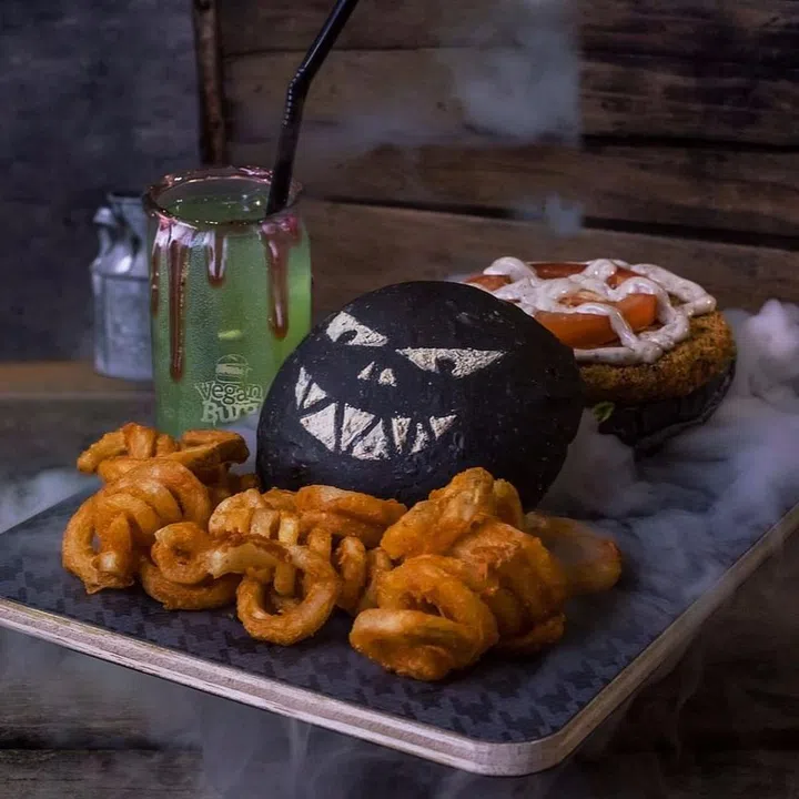 The burger itself features a ghoulish black charcoal bun head, with fillings including crispy plant-protein patty, dairy-free aioli, thick-cut juicy tomatoes and BBQ sauce.