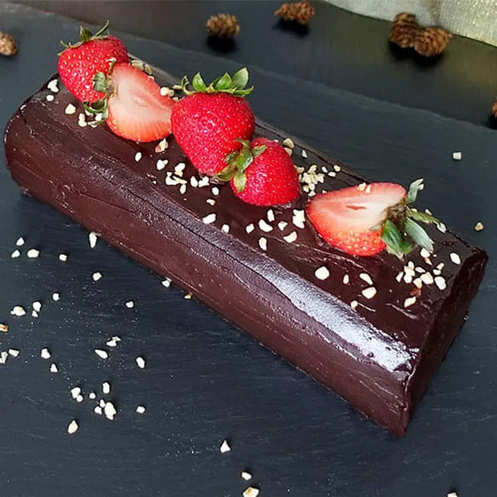 The strawberry chocolate log cake ($69.90) is made with almonds, eggs, organic coconut sugar, cocoa powder, strawberries and sustainable organic palm shortening.
