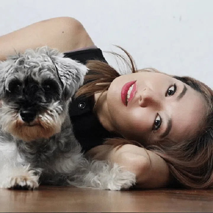 Actress and host You Yi and her dog make quite a cute pair. Here, You Yi poses on the ground with her furkid, Kuro.