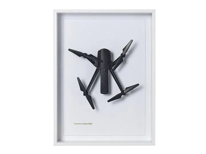 The creative duo of Humans Since 1982 often take iconic objects and recognisable signs and symbols out of their usual habitats and place them into new environments. Case in point: The drone, which is a present-day technological item, now rendered static as though it is a timeless artefact or specimen.