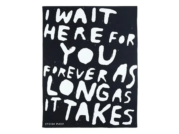 The phrase “I wait here for your forever as long as it takes” is emblazoned across this throw, originally scribbled in Marx’s notebook after seeing the message graffitied onto a wall in London.