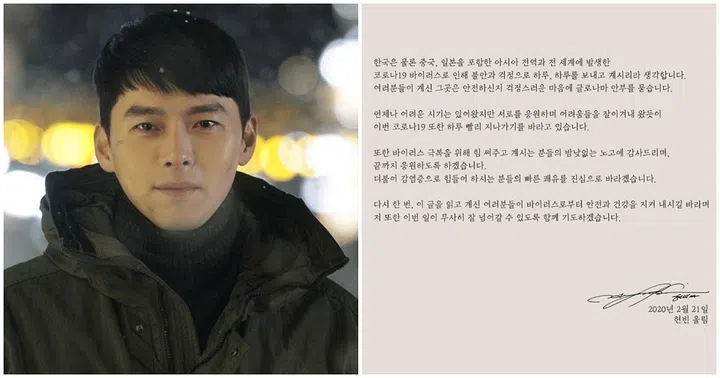 Crash Landing on You actor Hyun Bin wrote a warm message to all his fans saying: "I’m aware that as a result of the coronavirus, which has spread through China, Japan, Korea, as well as the entire world has caused your days to be filled with worry and anxiousness. I’m writing this letter to ask if you’re in a safe place. Just like how we always cheered each other on and overcame crises as difficult as this one, I’m hoping that the COVID-19 situation comes to an end soon.