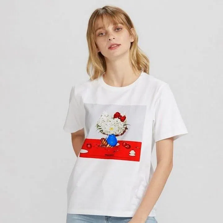 For a unique take on one of the world’s most recognisable characters, check out this shirt designed by art director Yuni Yoshida that depicts Kitty as a vase of flowers with baguettes for feet.