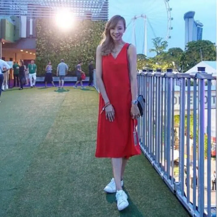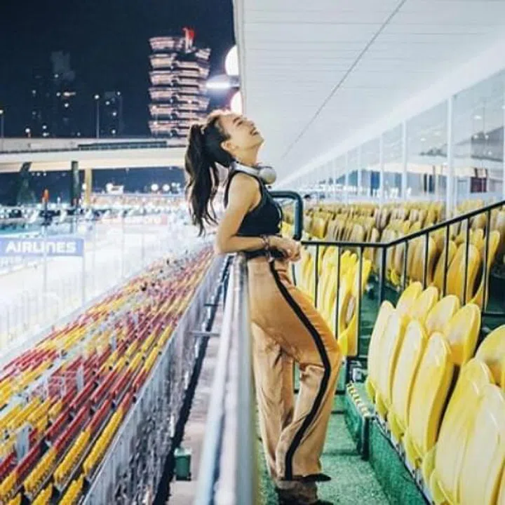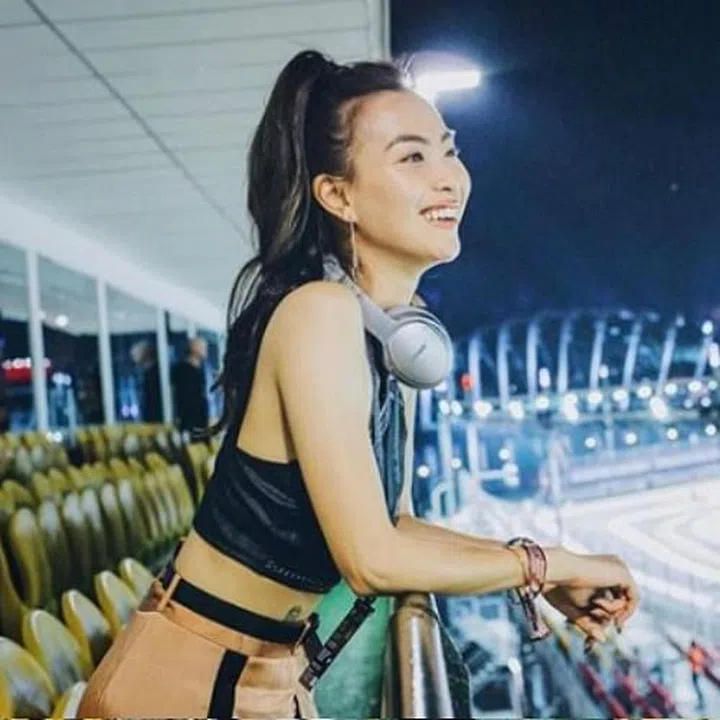 Dj, radio personality and influencer, Sonia Chew stepped into the limelight back in 2012 by winning 987FM’s DJ search. She spent her F1 weekend at the ApexLounge, wearing well-chosen gold pants with black piping down the sides, and a black crop top with heels. She absolutely nailed the 'sportsluxe' look.