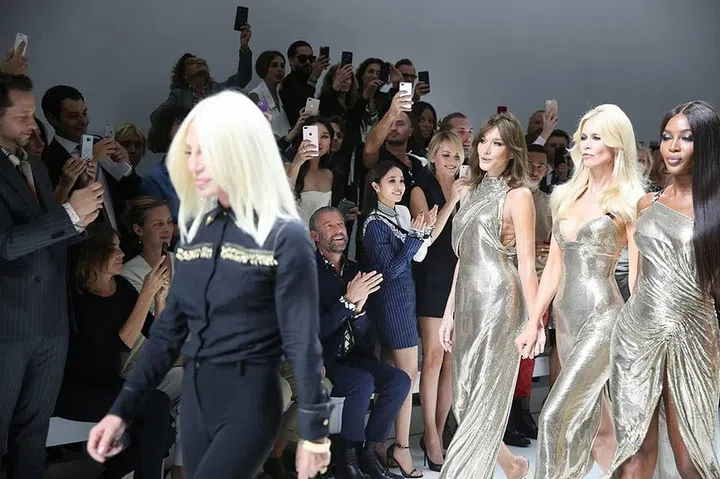 One of the major moments at the Milan Fashion Week was when Donatella Versace sent supermodels Carla Bruni, Claudia Schiffer, Naomi Campbell, Cindy Crawford and Helena Christensen down the runway. Everyone — including Mandopop star Jolin who stood up to applaud — was in awe with the ‘90s glam squad.