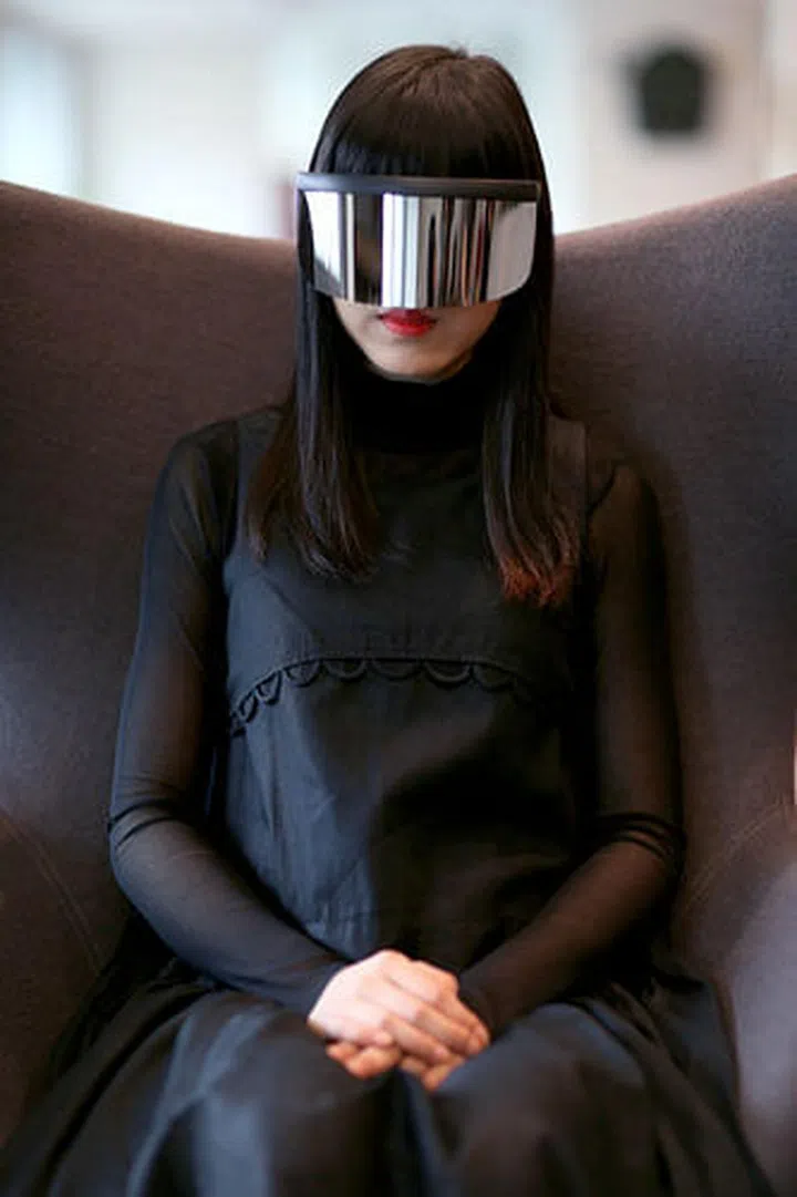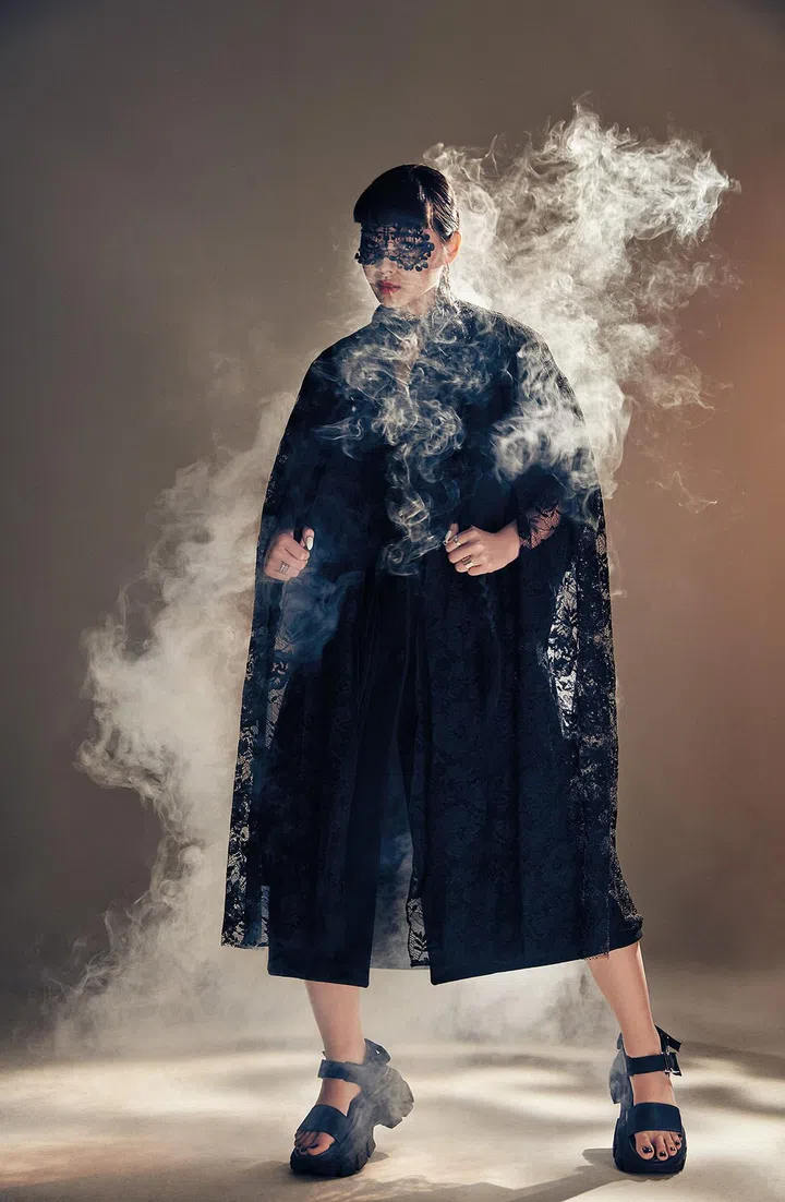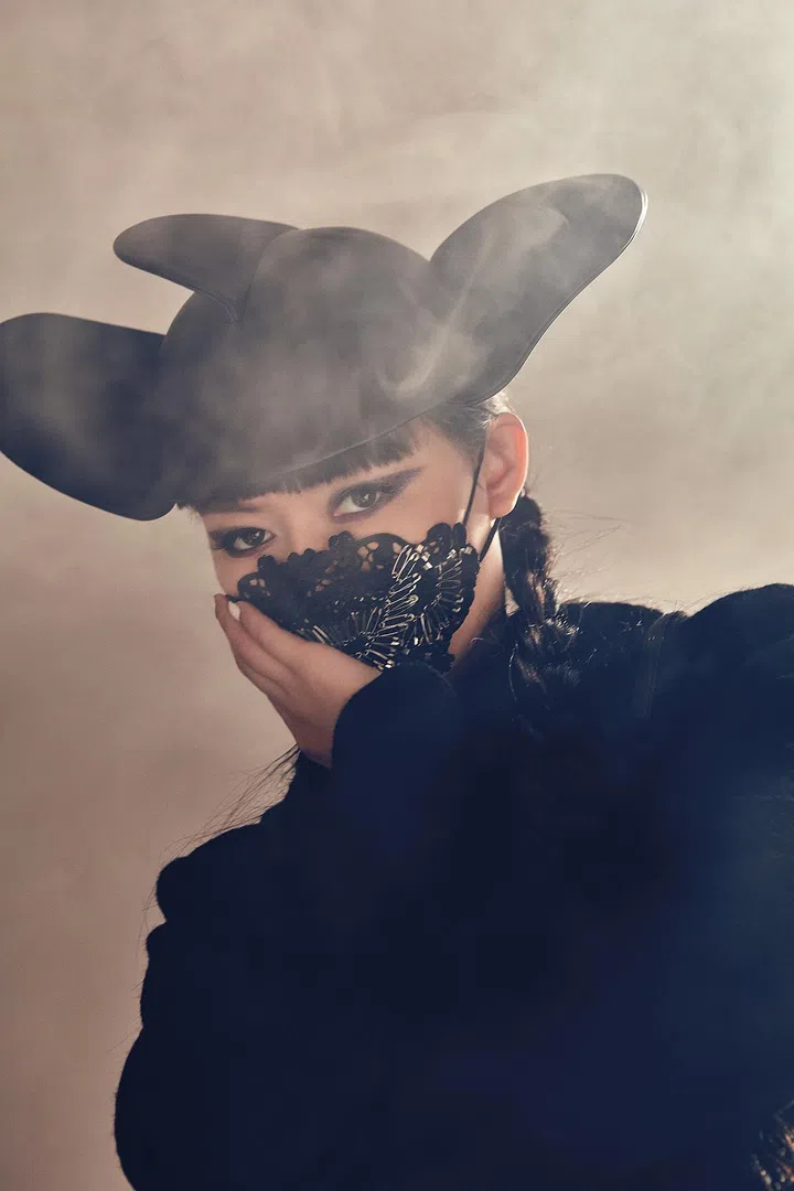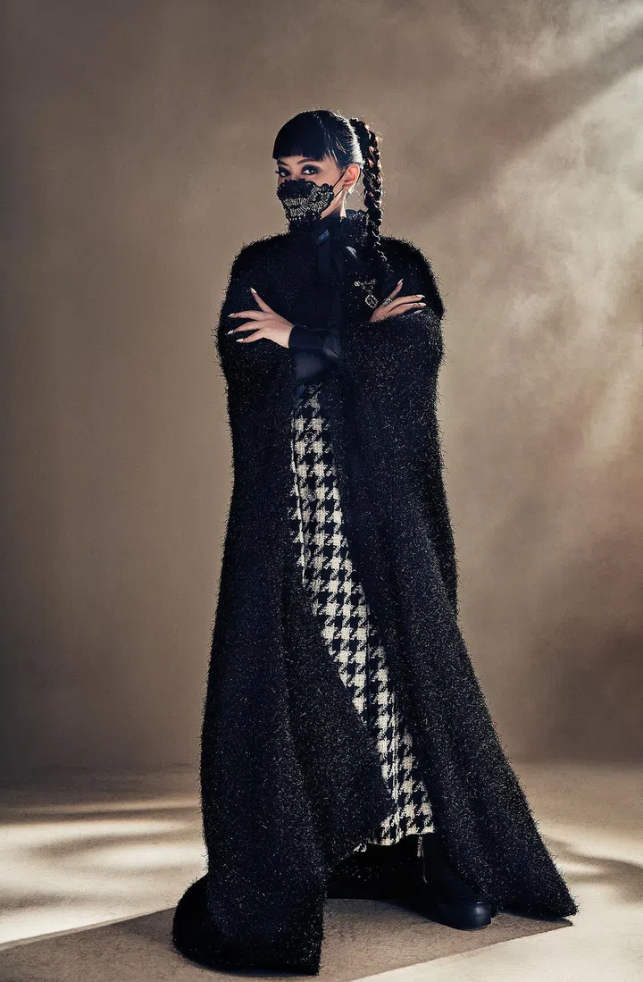 The electropop songstress who’s known for the sleek black outfits and bejewelled masks she dons onstage is barefaced and mask-free. She sports a casual look – a chic sheer top, basic black bermudas, black socks and a pair of slides. Her stage name, Sokko, means “blind” in Finnish, befitting her mysterious look.