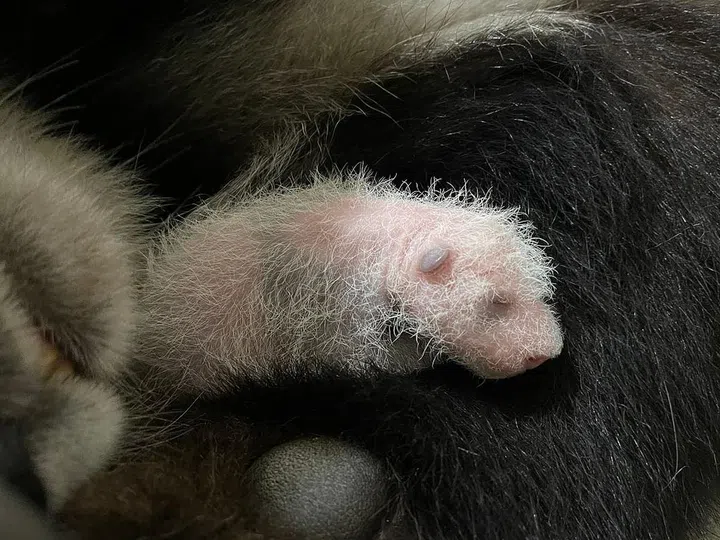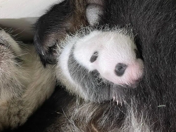Within his first month, Kai Kai and Jia Jia’s cub developed prominent black markings around his ears. His eyes and body transformed from a fur-less pink newborn to a miniature version of his parents.