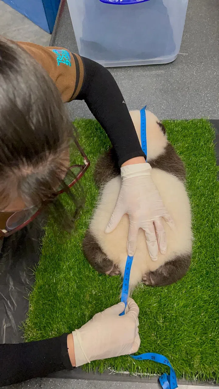 Lead panda caretaker and animal care officer, Trisha Tay Ting Ni measured the cub for the first time on Oct 6 (Day 54). The measurement: 51.5cm from the tip of his nose to the base of his tail, which is 7.5cm long. Good gains!