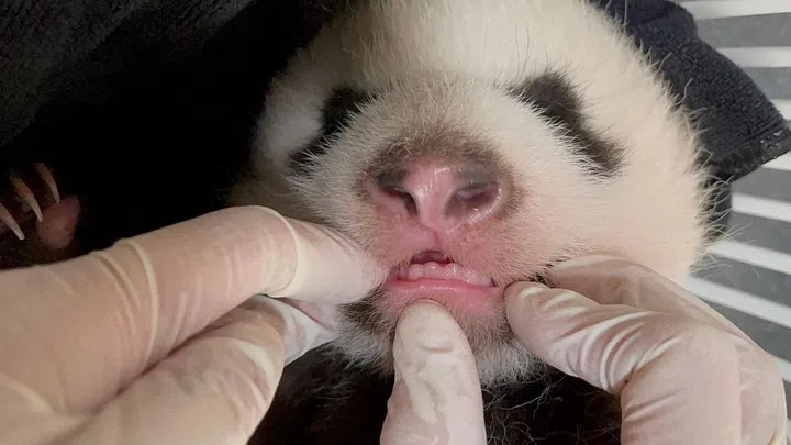 Six baby teeth were seen in this photo taken on Oct 4 (Day 52). On average, teeth for baby pandas start growing in at three months old, before they attempt eating bamboo from about seven months old.
