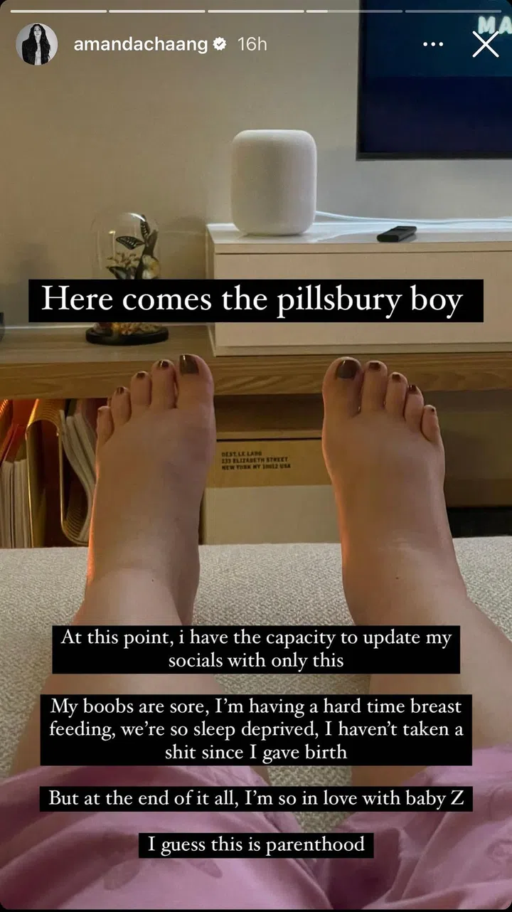 There haven't been many updates from new mum Amanda Chang, who understandably, must have her hands full with her bundle of joy. However, she did share a glimpse of her postpartum journey with her followers on social media. In one particular Instagram Story update, Amanda snapped a photo of her feet, which are bloated from the water retention, and talked about her struggles with breastfeeding, sleep deprivation and more.