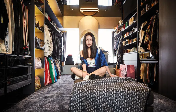 Lim, in her own Gucci overshirt and swimsuit, Thom Browne skorts and Chanel boots, perched on an ottoman in the middle of her impressive walk‐in wardrobe.