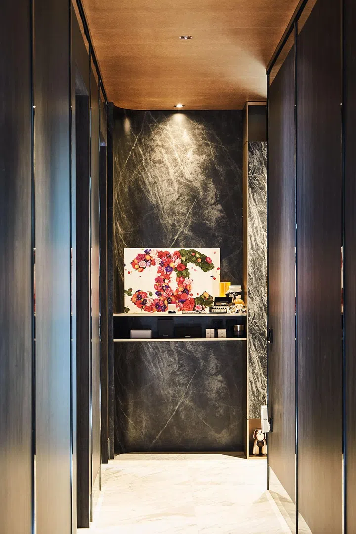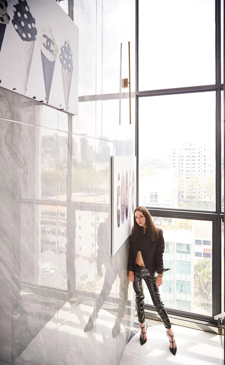 There is that same lack of pretension to the beauty entrepreneur’s new house: A double-storey penthouse in the Balmoral area that spans some 6,000sqft. Despite the size, it is far from showy or ostentatious; the overall vibe is intimate, cosy even—with sleek grey marble and glass offset with cushy cream furnishings. At the time of our visit, the entire rug and coffee table in the upstairs living room has been taken over by her son’s toys; the smaller living room downstairs is still a work in progress.