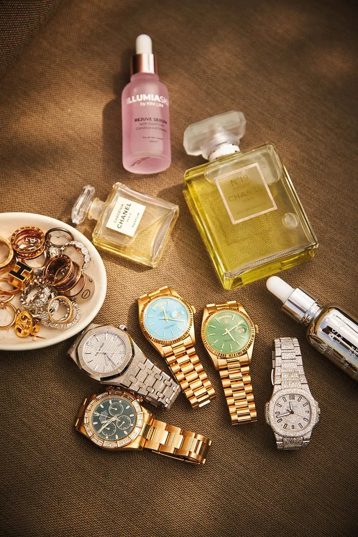 Lim’s face serums from her own brand, Illumia Therapeutics, among a cocktail mix of iconic scents, watches and jewellery.