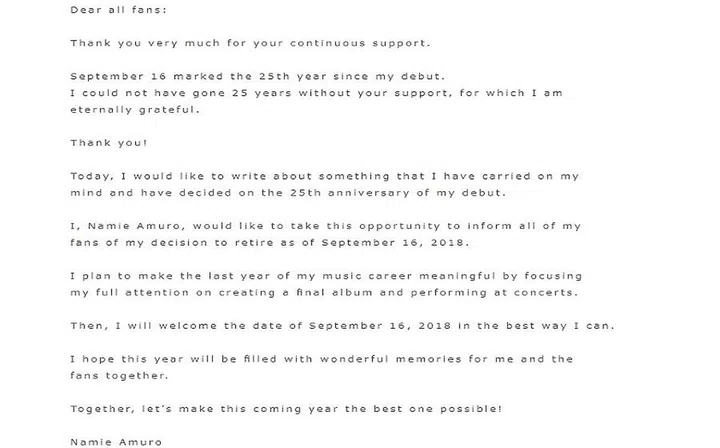 She said on her official website: "I would like to write about something that I have carried on my mind and have decided on the 25th anniversary of my debut. I, Namie Amuro, would like to take this opportunity to inform all of my fans of my decision to retire as of Sept 16, 2018."