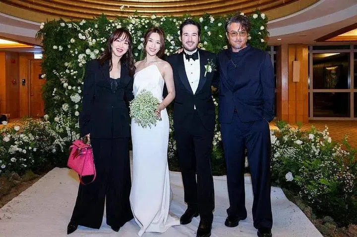 Celebrity couple Fann Wong (far left) and Christopher Lee (far right) at Rebecca Lim’s wedding.