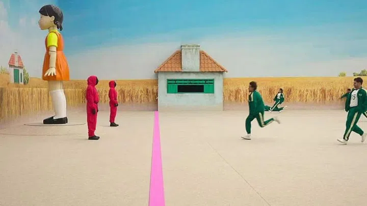 Squid Game: The Challenge’s first game – Red Light, Green Light – features 456 contestants running towards a finish line where a giant robot doll stands.
