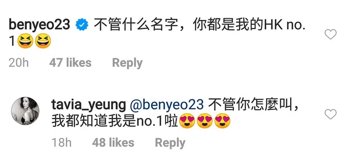 Singapore actor-host Ben Yeo: No matter what name you go by, you'll always be my HK no.1! Tavia Yeung: No matter what you call me, I know I'm no. 1!