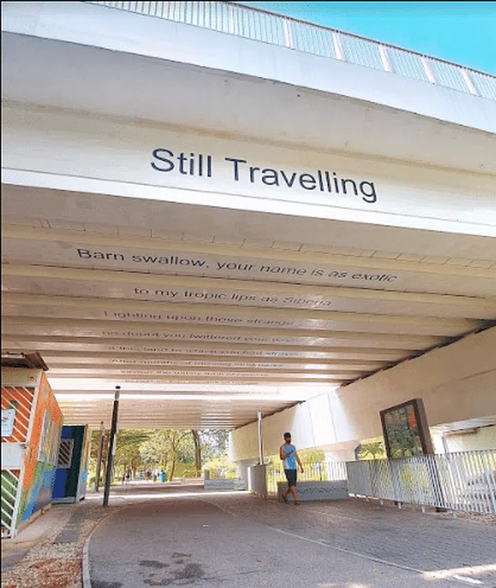 A reference to Robert Yeo’s poem Those in Urban Yellow (2012), this installation lines two sides of the bridge. The first stanza faces dawn, while the second faces dusk. The translucent yellow drapes invites viewers to look through them at nature, lending a warm glow to the view and encouraging them to look towards a positive post-COVID future.