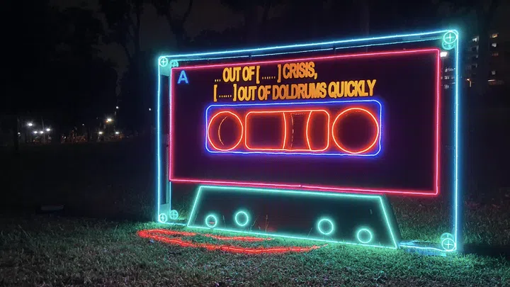 This larger-than-life sculpture of an audio cassette features part of a poem titled “Fan Fiction”, which is part of Singaporean writer Yong Shu Hoong’s publication Anatomy of a Wave published in 2021. With parts of it redacted, it invites viewers to fill in the blanks themselves and reflect on the myriad possibilities of meaning.