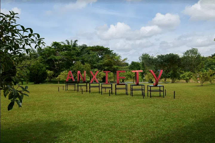 Viewed from one side, it spells out “anxiety”, but from the other, it spells out “courage”. This installation represents a literal shift in perspective and how hope is present even in the darkest times. Examine it more closely, and you’ll realise the installation is intricately woven with threads, symbolising our interconnectedness and strength in unity.