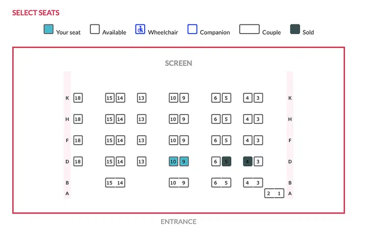 Seats are configured to be sold in pairs and singularly (at certain outlets and halls) to ensure a one-metre safe distance between moviegoers.