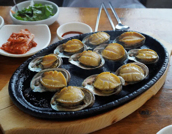 The freshness and sweetness of Jeju’s seafood is so renowned that Styrofoam boxes packed with fish and abalone (and icepacks) are a common sight at the check-in counters at the Jeju airport. South Koreans rarely leave Jeju without packing some local seafood to bring home. And no islander visits family on the mainland without taking some abalones. Jeju abalones are best eaten grilled on a hotplate or cooked in porridge.