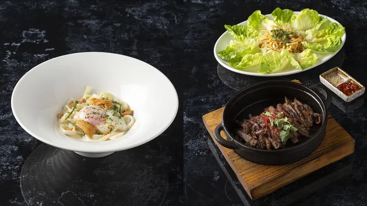 — Wagyu Truffle Beef Hor Fun (S$32 /L$58) - featuring wok-fried flat noodles topped with exquisite slices of US wagyu short rib with crispy deep-fried hor fun strips and poached egg, Not to mention, it's also topped with truffle gravy that's simply mouthwatering.