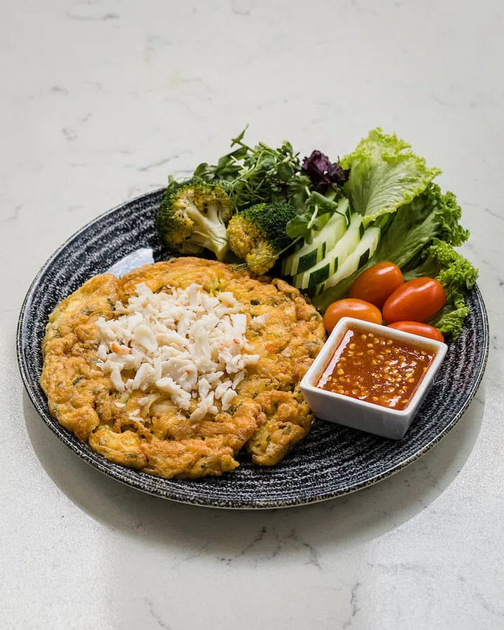 — Cha-Om Crab Meat Fried Egg ($22+) - Golden brown omelette of silky crab meat with thin ribbons of acacia leaves with moreish nam prik kapi.