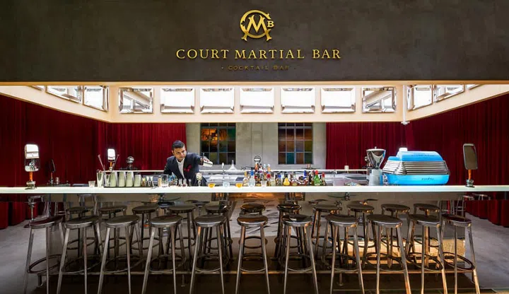The military connotations to its name may be more for design form than actual functionality, but the Court Martial Bar at level one of JW Marriott Singapore South Beach does have its historical ties – it occupies the former Singapore NCO Court Martial office of the ’40s). As an homage to the bygone era, touches like coasters with the prints of rank patches and a logo inspired by lettermark stamps dot the place.