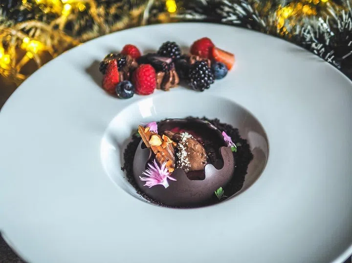 Appetisers include a cauliflower cream soup with milk bath salmon or a coconut lime cured kingfish with pineapple, while mains include a spiced lamb rump with garam marsala dhal and cucumber apple mint yoghurt or braised beef cheek with potato rocket purée, parmesan cream and wild rice. Dessert is an intriguing hot chocolate soup with black pepper ice cream and sesame crisp that is a flavourful blend of sweet and spicy.