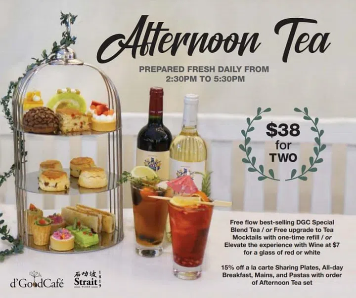 Its decadent savouries include a kueh pie tee stuffed with Hainanese chicken rice, asparagus parfait and otah sandwich, while delightful sweets include a kaya pandan roll, a Strawberry Bursting Boba Tart, and Chocolate Choux au Craquelin. Enjoy your bites with a free flow of its best-selling DGC Special Blend Tea, or upgrade it to a Tea Mocktail with a one-time refill. Alternatively, get a glass of red or white for an additional $7.