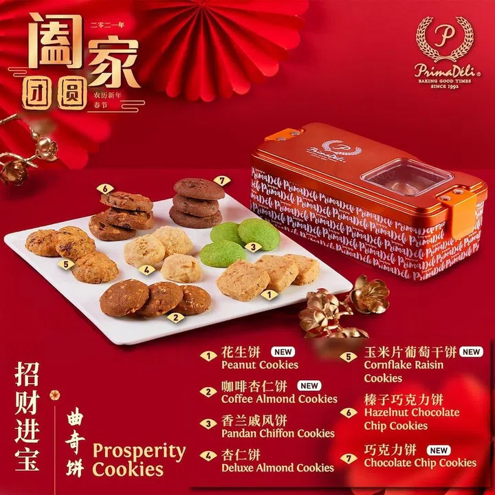 Homegrown bakery PrimaDéli has launched a line-up of seven Prosperity Cookies this year, where new flavours include Pandan Chiffon Cookies, and Cornflake Raisin Cookies, both costing $19.80 per tin.
