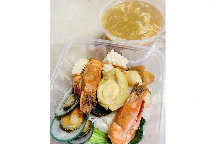 A real steal, considering the amount of seafood - a whole mid-sized Tasmanian abalone, two large prawns, two scallops, three mussels, squid and fried fish fillet - stacked on the rice and cooked to perfection. It comes with ample egg-thickened brown gravy, packed separately, so you can keep half for your home cooking.