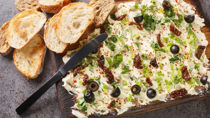 Juicy and crunchy all at once, this butter board is a showstopper, thanks to its striking red hue. Dice up some cherry tomatoes and red onions, and sprinkle mint and almonds to taste.