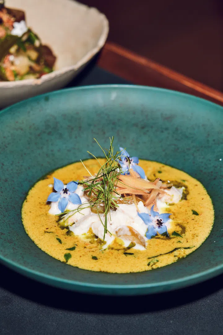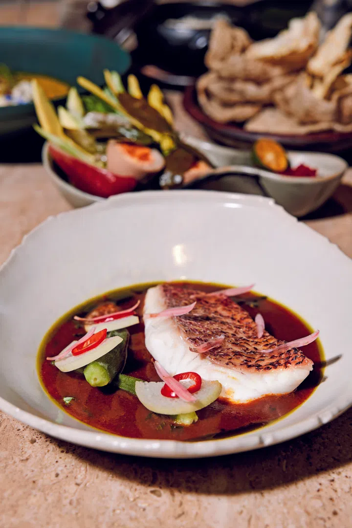 A tender line-caught red emperor nestled in a tangy, spice-laden assam pedas with okra and yam stalk