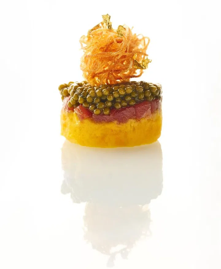The Causa: baked, chopped oca topped with smoked chutoro, caviar and silvers of crunchy potato. Photo: Araya