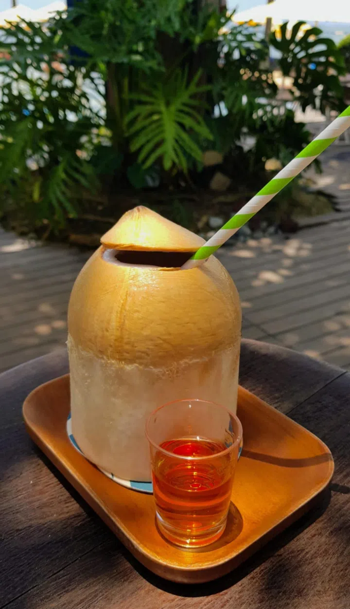 And finally, what is a beach outing without coconut or rum? This is as straightforward as it gets - a whole young coconut is served with a shot of banana rum for a spike of booze that is a timeless match for coconut water. Banana rums have a sweet burnt sugar and caramel or vanilla notes to notch up the tropical flavour.